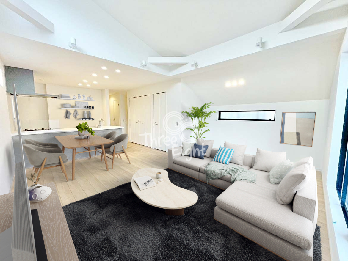 <バーチャル家具写真> 19.4帖もの広さを有するLDK! 一部吹き抜け構造になっており、開放感のあるお部屋です。 一部には床暖房を搭載し、寒い日でも足元からじんわり暖か♪ ご家族が集まりやすい空間になりました。