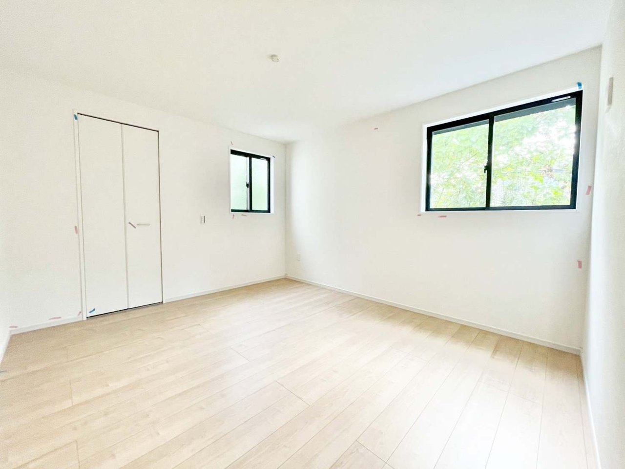 こちらは1階にある7.2帖の洋室。 ダブルベッドを配置しても余裕のある広さです♪ 西側の窓には電動シャッターが付いており、防犯面でも安心! 雨風が強い日に、飛来物などから窓を守る役割も◎