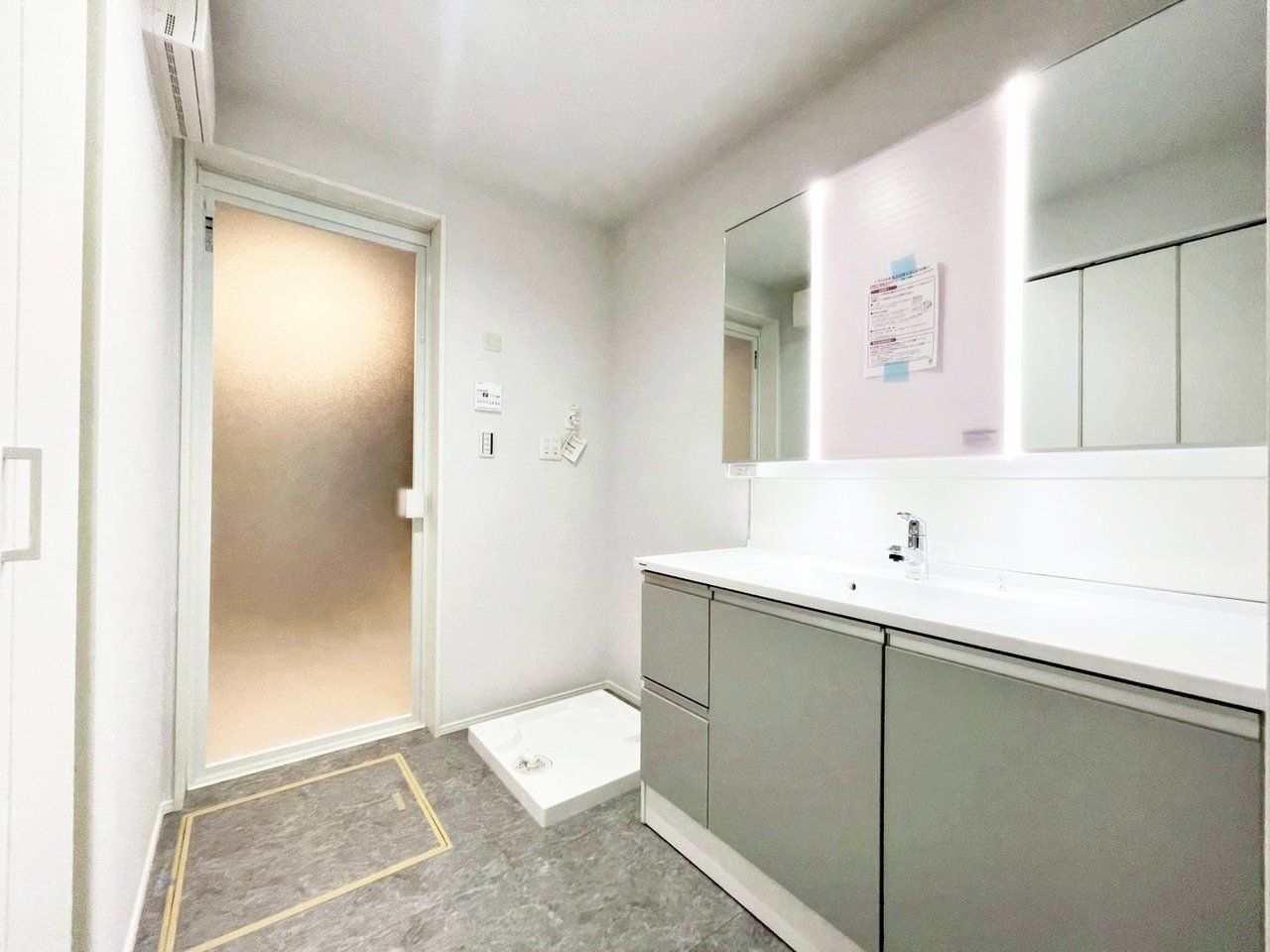 <内観予想パース図> 洗面スペースには大型の洗面台を設置! 収納も豊富で、小物類などもスッキリと片付きます。 ガス式乾燥機も付いていますので、お洗濯物を素早くカラッと乾かすことが可能です。