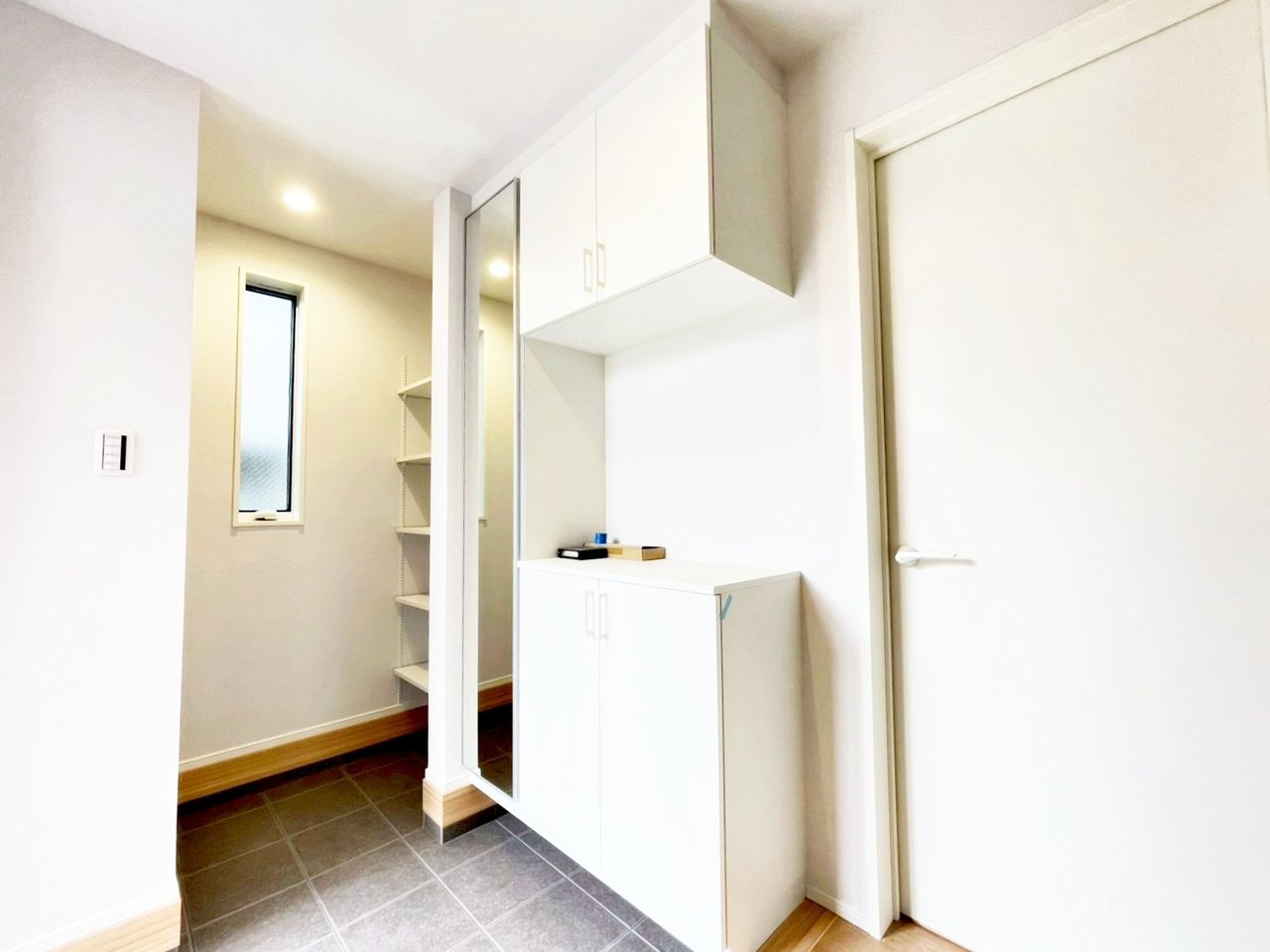 <内観予想パース図> 玄関横には大型のシューズボックス。 姿見も付いていますので、お出かけ前に全身チェックが可能です。