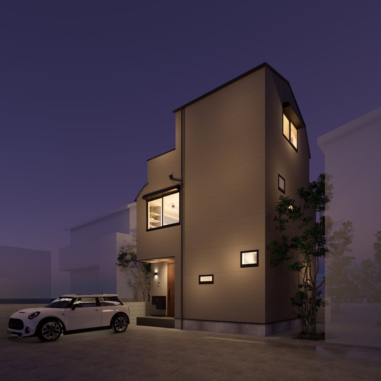<外観予想パース図> 夜には暖かい光が迎えてくれます。 落ち着いた雰囲気で飽きのこない外観です。