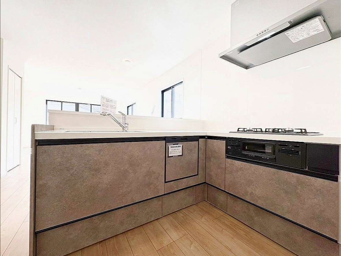 <1号棟> キッチンは使い勝手の良い、L型システムキッチンを採用しました! 人気の対面型なので、ご家族との会話を楽しみながらお料理ができます♪ リビングを広く見渡せるので、小さなお子様との暮らしも安心
