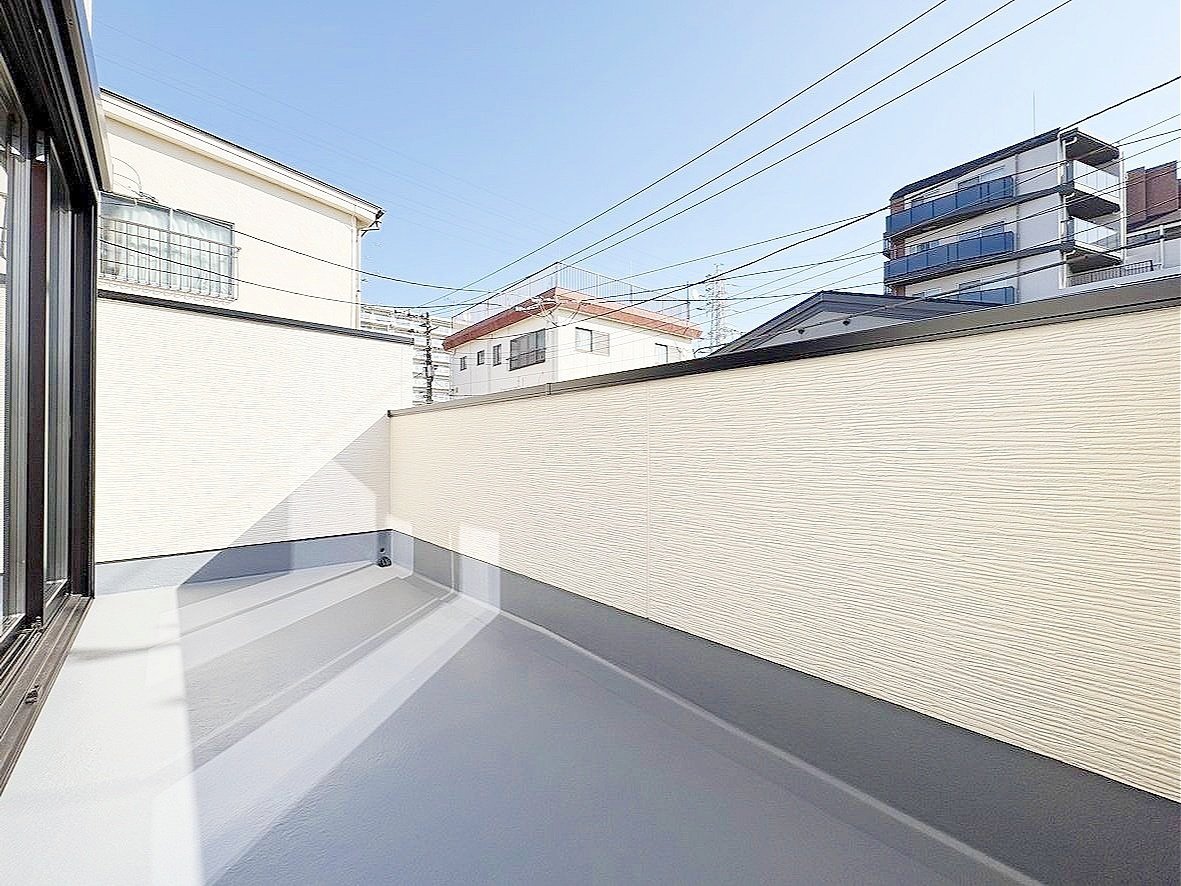 <1号棟> バルコニーは2階と3階に1つずつございます。 どちらも幅・奥行き共にゆとりある大きさで、洗濯物を干す際に窮屈さを感じません♪ テーブルセットを配置して、テラスのようにして使うことも◎