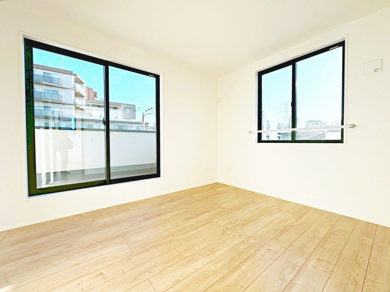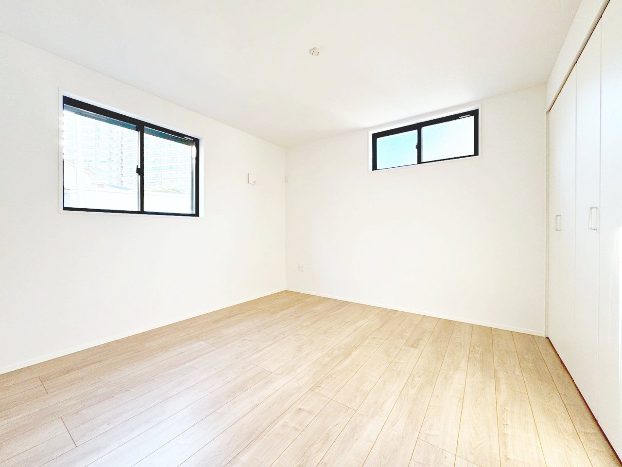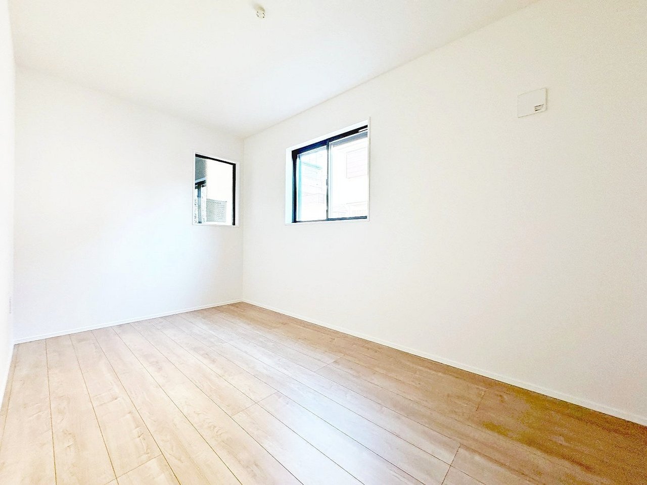 <1号棟> こちらは1階にある5.6帖の洋室。 大きい方の窓にはシャッターが付いており、防犯面でも安心の仕様♪ 家具配置のしやすい形で、インテリアコーディネートを楽しむ事ができます!
