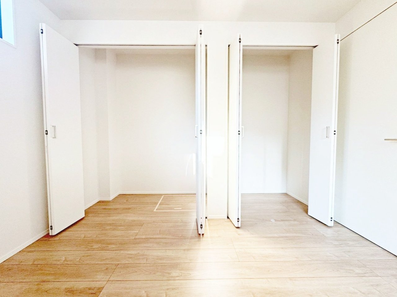 <1号棟> こちらは6.1帖の洋室。 ダブルベッドを配置しても余裕のある広さ! 収納スペースが2つあり、お部屋の有効スペースを損なうことなく綺麗に片付きます♪ ■0120-1919-80■