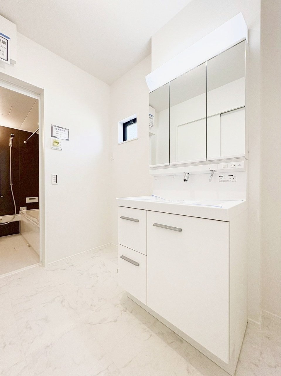 <1号棟> 洗面台は毎日の身支度に便利な三面鏡タイプを採用♪ 鏡の裏まで収納スペースになっており、雑多としがちな洗面台回りが綺麗に片付きます! ■0120-1919-80■