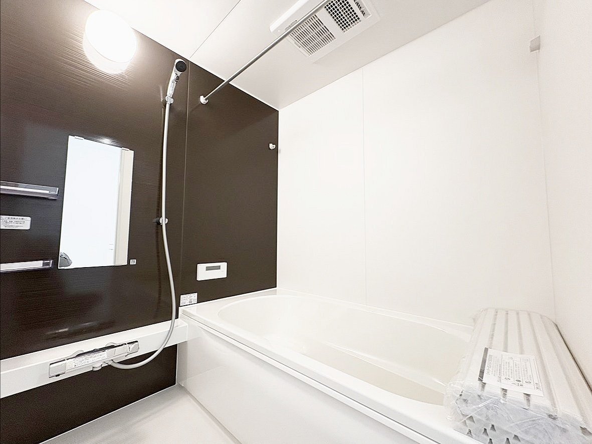 <1号棟> 毎日の疲れをいやすバスルームは、落ち着きのある色合いをチョイス♪ 浴室乾燥機を搭載しており、雨の日はここ洗濯物を乾かすことができます! もちろん、日々のカビ対策にも◎