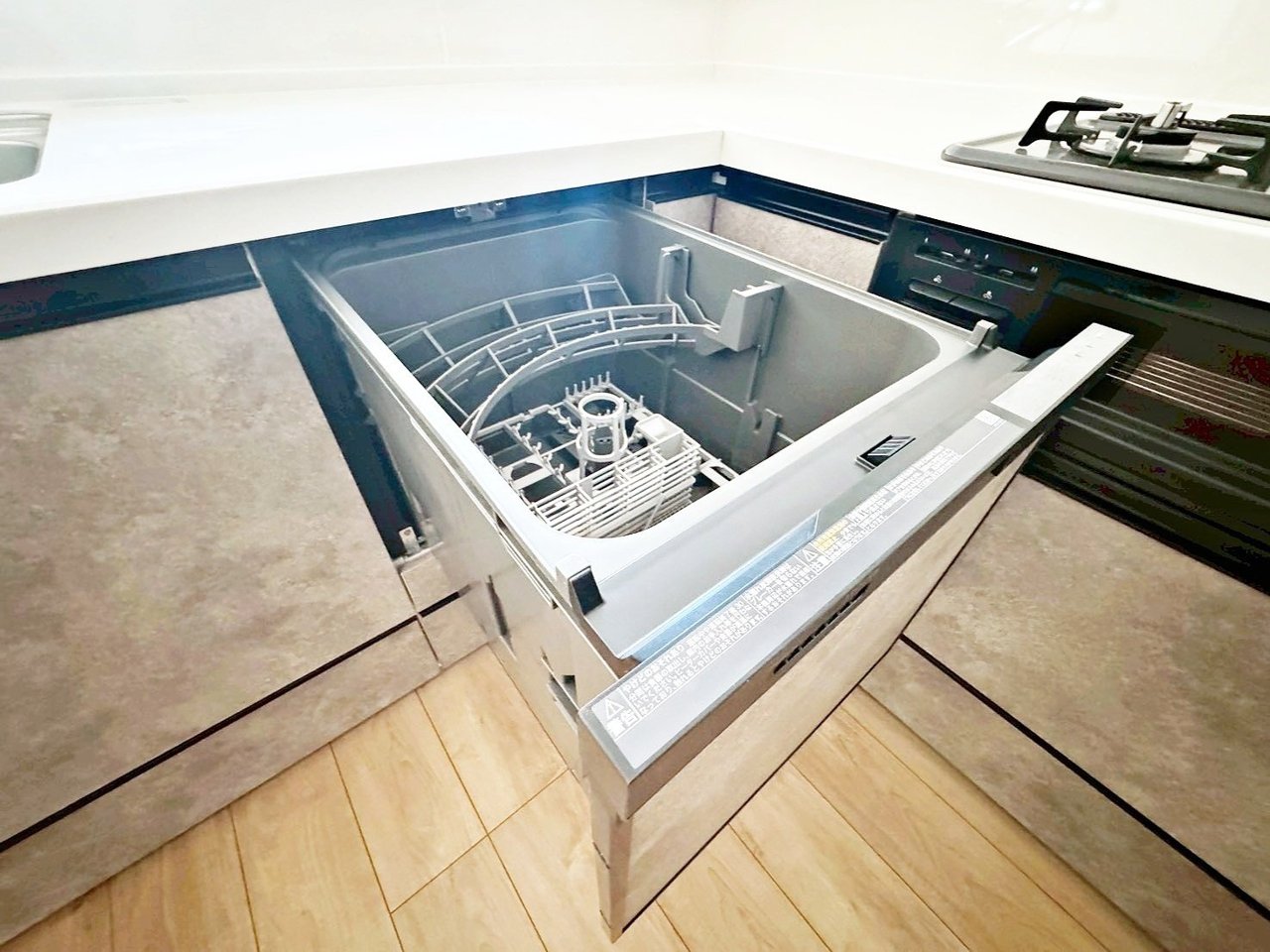 <全棟共通設備> システムキッチンにはなんと食洗器が内臓されています! 毎日の面倒な洗い物は、食洗器にお任せしちゃいましょう♪ 洗剤による手荒れが心配な方にも嬉しい設備です。 0120-1919-80