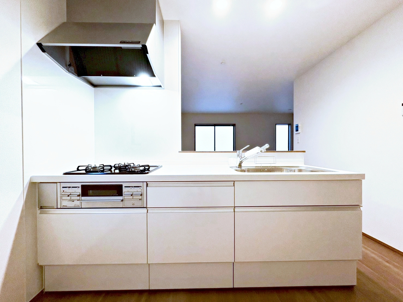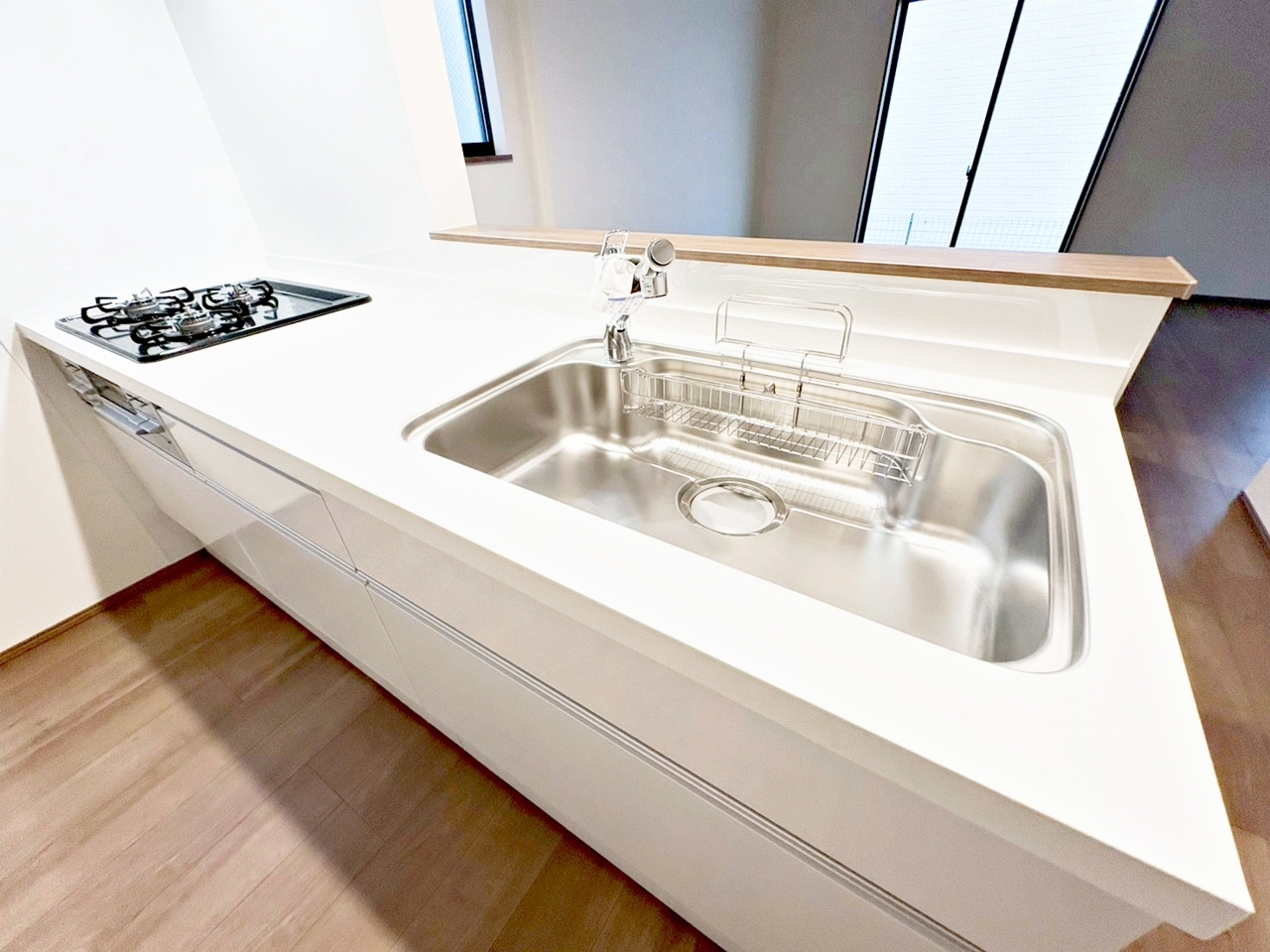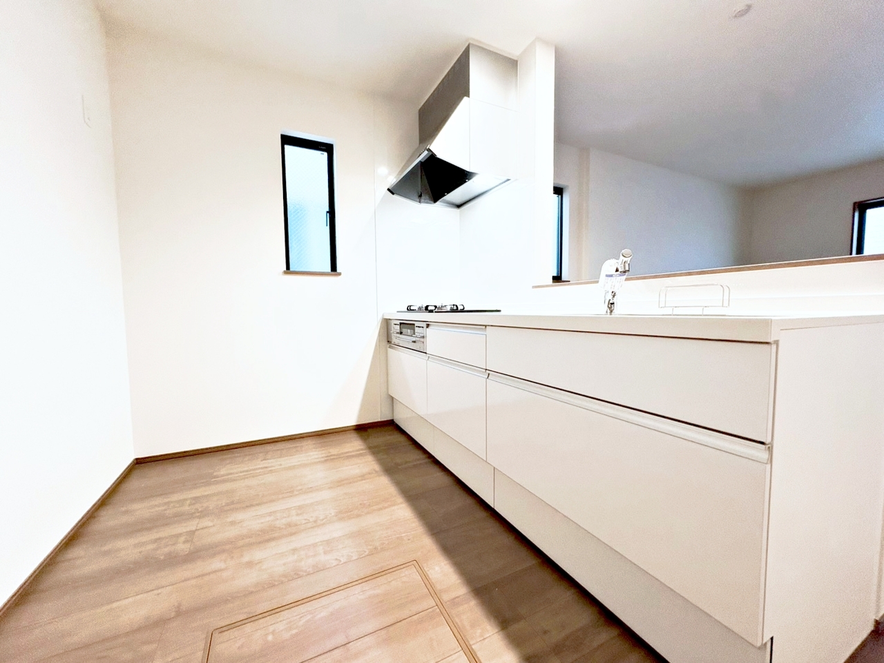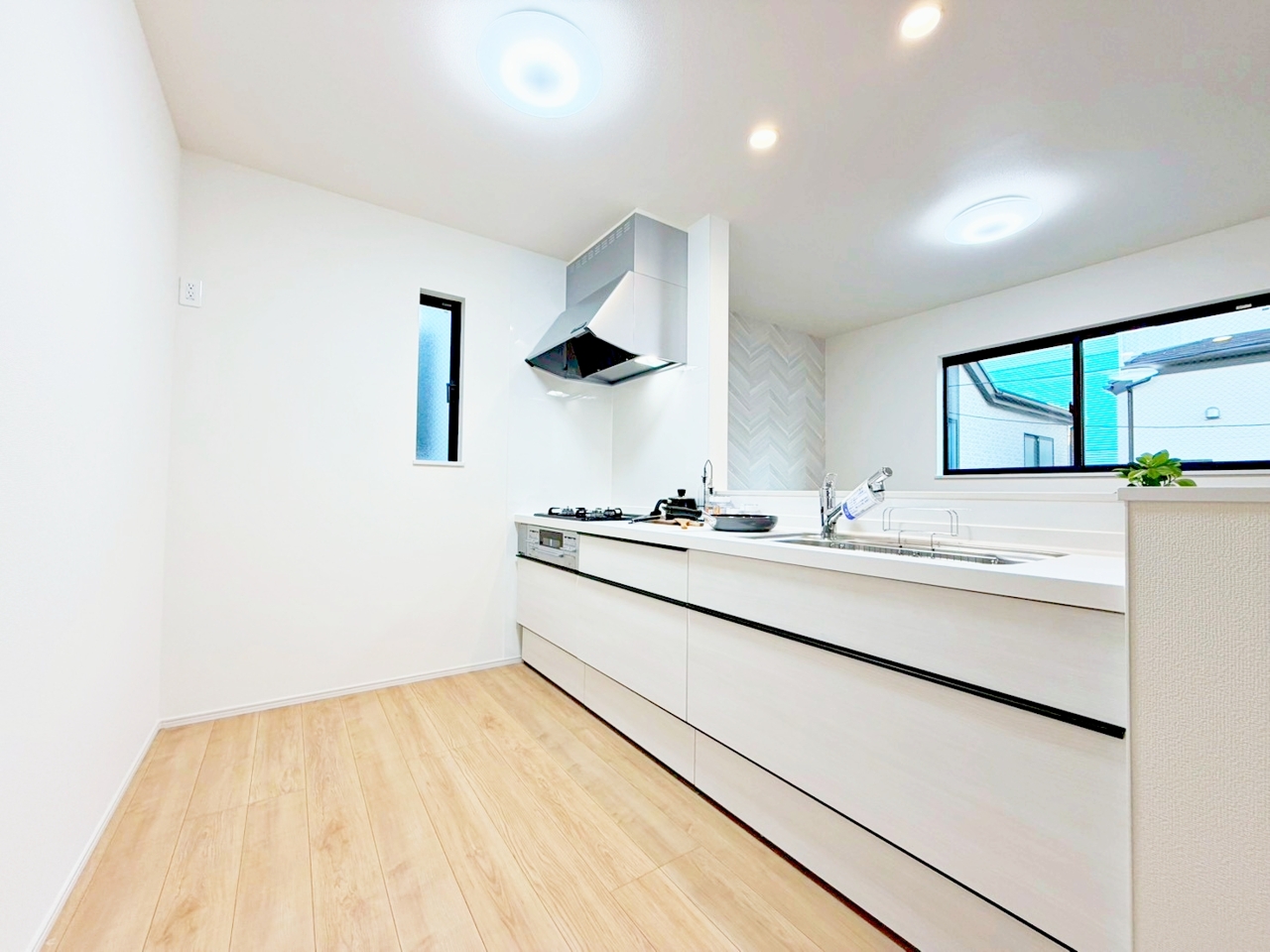 <N号棟> キッチンスペースもこんなにも広々! お子様と並んで、一緒にお菓子作りなどを楽しむことができます♪ コンロ横にも小窓を付け、お料理中の煙やニオイが逃がしやすくなっています。