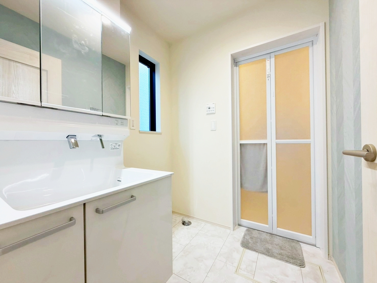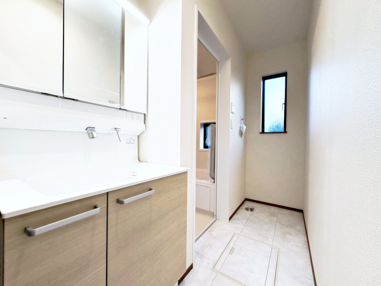 <N号棟> 洗面台は毎日の身支度に便利な三面鏡タイプを採用♪ 鏡の裏まで収納スペースになっており、雑多としがちな洗面台回りが綺麗に片付きます!
