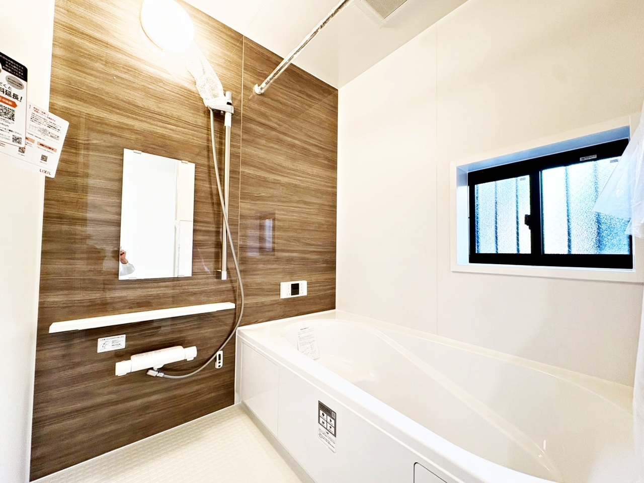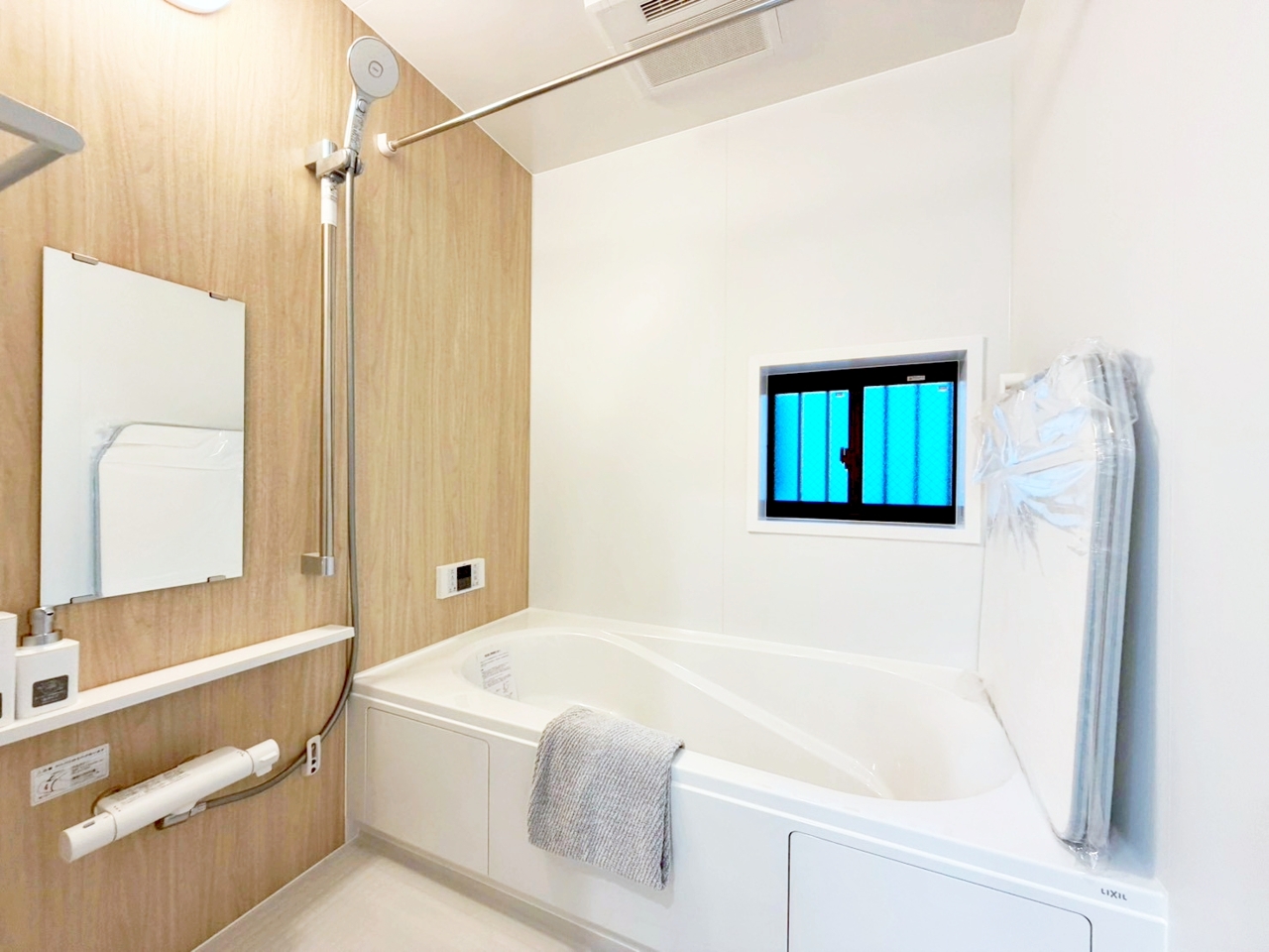 <N号棟> 毎日の疲れをいやすバスルームは、落ち着きのある色合いをチョイス♪ 浴室乾燥機を搭載しており、雨の日はここ洗濯物を乾かすことができます! もちろん、日々のカビ対策にも◎