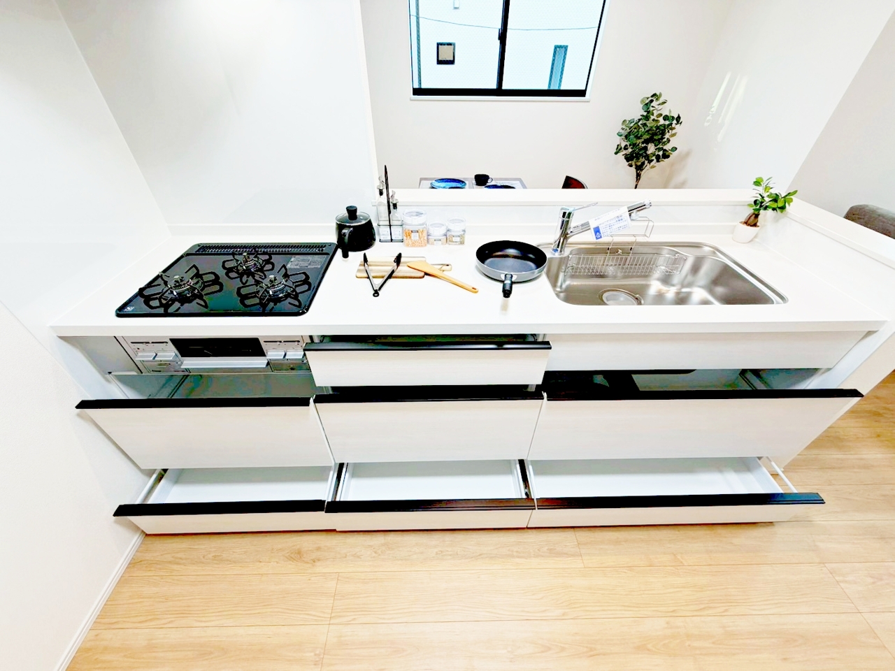 <N号棟> 人気の対面型システムキッチンを採用! お料理をしながらご家族との会話を楽しむ事ができます♪ 収納たっぷりタイプで、調味料・調理器具がスッキリ綺麗に収納可能です♪ ◆0120-1919-80◆
